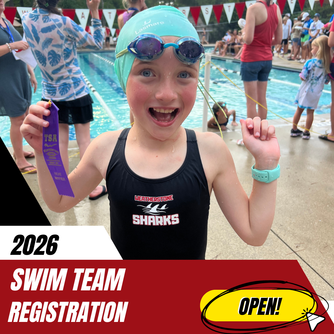 The Weatherstone Sharks team is a proud member of the Southern Division of the Tarheel Swimming Association - North Carolina's largest summer recreational youth swim league. League dual meets are held on Tuesday evenings beginning early June through late July. Our home meets and practices are held at the neighborhood pool at 1501 Castalia Road in Cary. Weatherstone has a five-lane pool, so we use four lanes for Main Events during dual meets. The pool deck is lighted at night, and the team provides a variety of concessions at each meet. The Sharks use the Time Drops timing system. We look forward to welcoming our competitors to our pool this summer!
